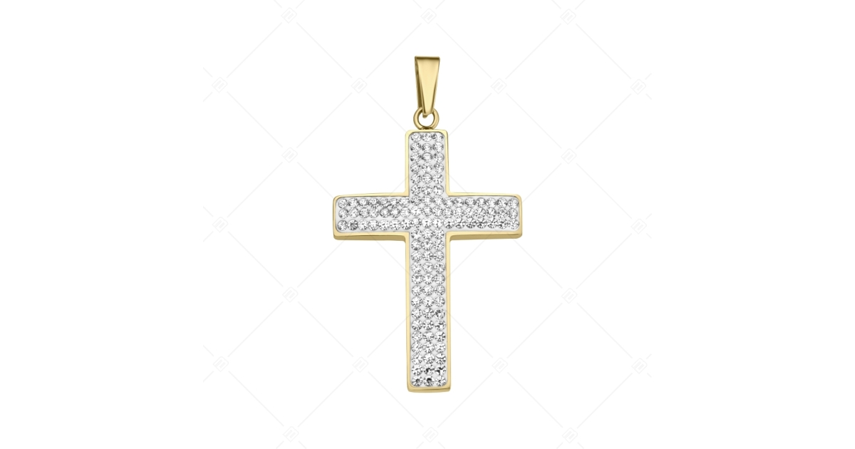 Wunderschöner kreuzförmiger Anhänger mit eingelegten glänzenden tschechischen Kristallen. Schmuck aus medizinischem 316L-Edelstahl mit 18K vergoldet.