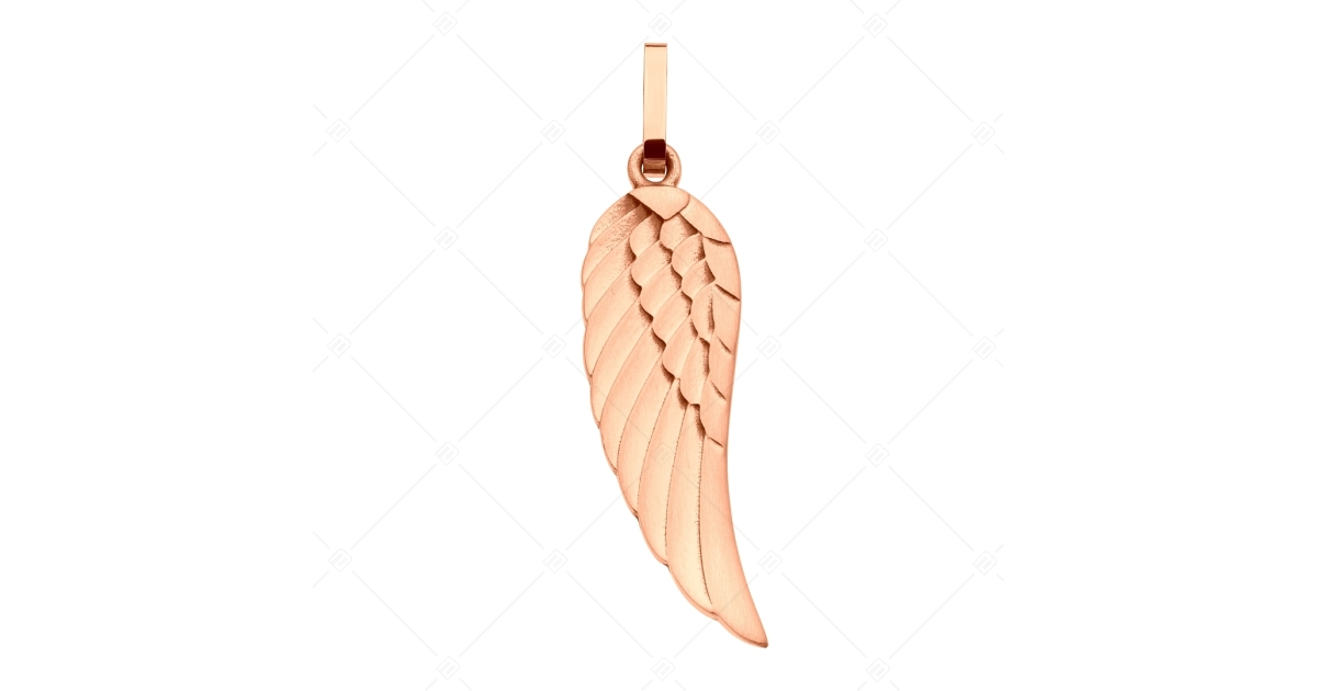 Engelsflügel-Anhänger aus medizinischem 316L-Edelstahl, seidenglanzpoliert und 18K rosévergoldet. Die Polierung verleiht dem Anhänger einen angenehmen Lichteffekt. Dank seines Materials ist er antiallergisch, abriebfest und bruchfest.