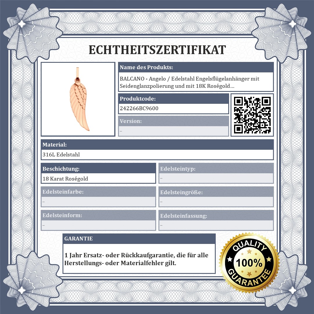 BALCANO - Angelo / Edelstahl Engelsflügelanhänger mit Seidenglanzpolierung und mit 18K Roségold Beschichtung
