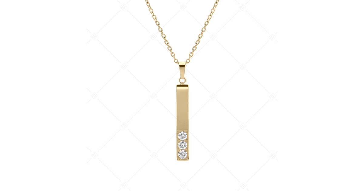 Medizinischer, antiallergischer 316L-Edelstahl Schmuck, 18K vergoldet. Flache Ankerkette mit verstellbarer größe und sicherem delphinverschluss. Eleganter rechteckiger Anhänger, verziert mit drei Zirkonia Edelsteinen.