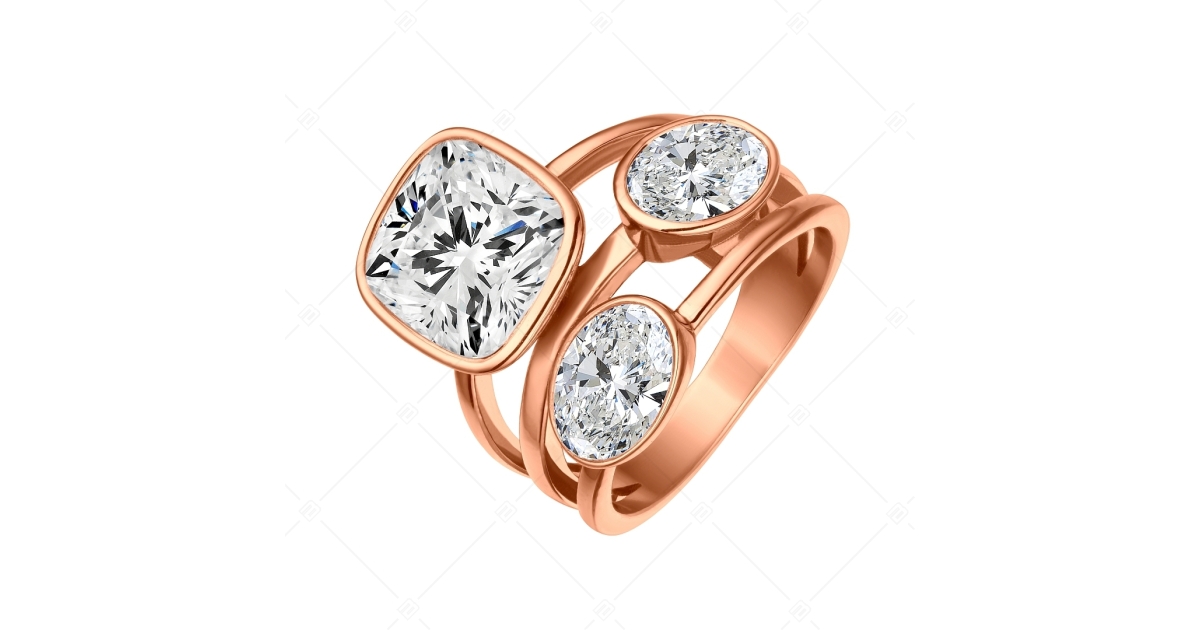 Ein wirklich auffälliger Ring mit drei funkelnden, klaren Zirkonia-Edelsteinen, von denen zwei oval und der größte kissenförmig geschliffen ist. Hergestellt aus antiallergischem 316L-Edelstahl mit Hochglanzpolierung und 18K Roségold Beschichtung. Mit diesem Schmuckstück werden Sie garantiert nicht unbemerkt bleiben!