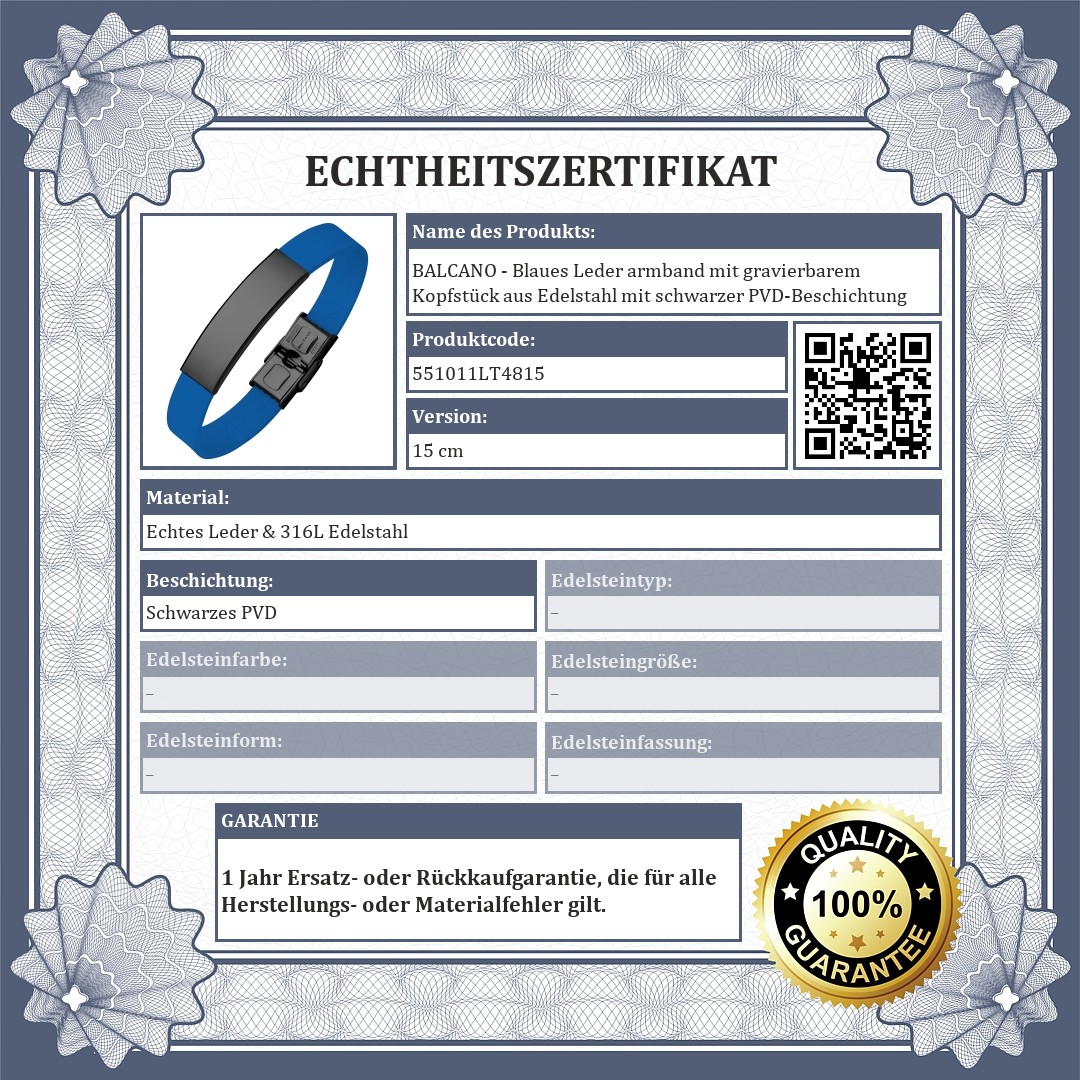 BALCANO - Blaues Leder armband mit gravierbarem Kopfstück aus Edelstahl mit schwarzer PVD-Beschichtung
