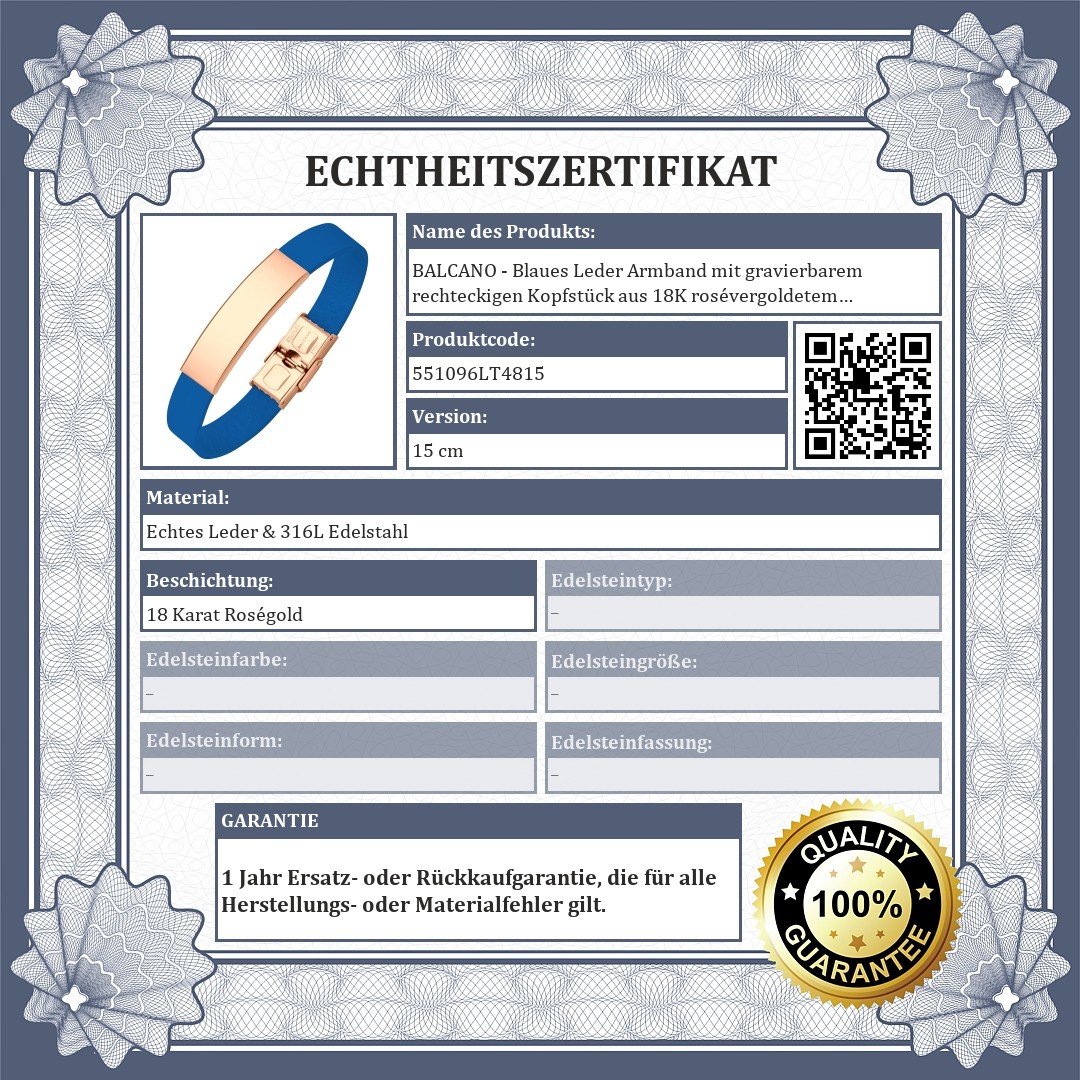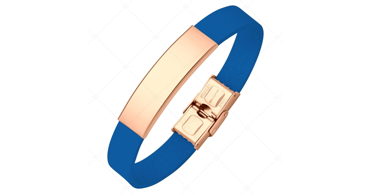 BALCANO - Blaues Leder Armband mit gravierbarem rechteckigen Kopfstück aus 18K rosévergoldetem Edelstahl
