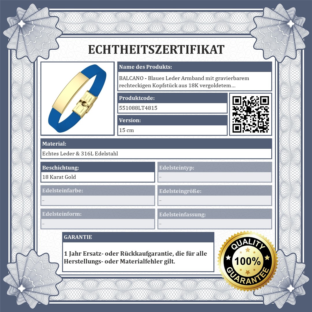 BALCANO - Blaues Leder Armband mit gravierbarem rechteckigen Kopfstück aus 18K vergoldetem Edelstahl