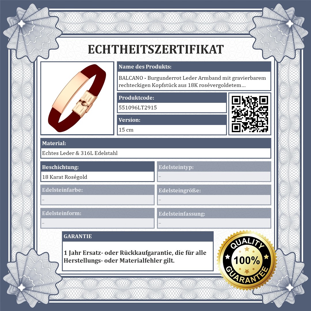 BALCANO - Burgunderrot Leder Armband mit gravierbarem rechteckigen Kopfstück aus 18K rosévergoldetem Edelstahl