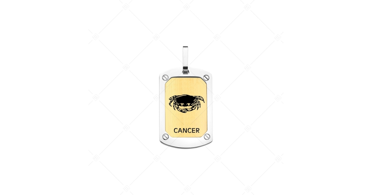 Antiallergischer, rechteckiger horoskop Anhänger von Edelstahl mit dem bild des sternzeichens Krebs. Schmuck aus medizinischem 316L-Edelstahl, der aufgrund seines materials extrem langlebig ist. Hochglanzpolierte, 18K vergoldete, matte oberfläche mit eingravierten und gemalten sternzeichen symbolen.