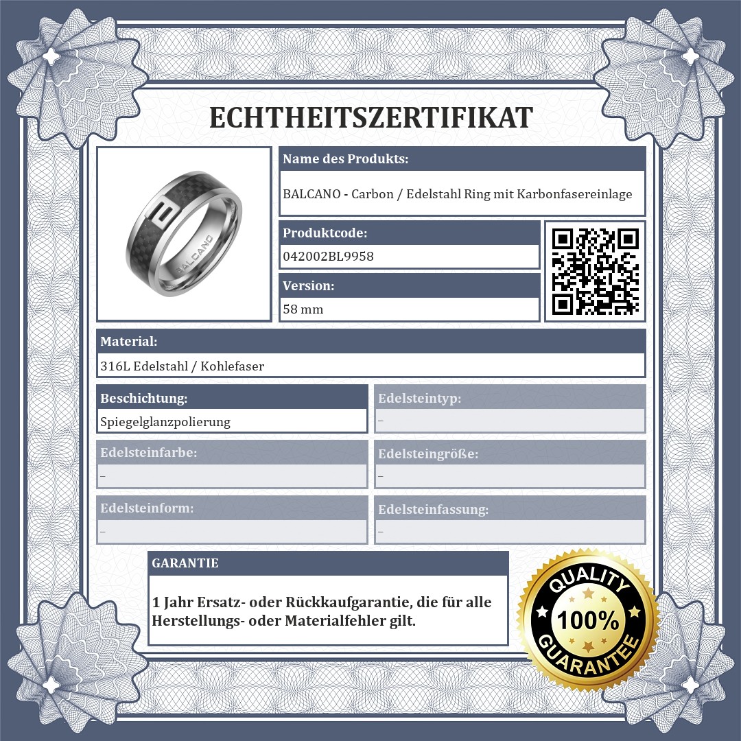 Antiallergener 316L-Edelstahlring mit Hochglanzpolierung. Der modische und einzigartige Schmuck ist in der Mitte mit einer Einlage aus schwarzem Carbon (Kohlenstofffasergewebe) mit einem BALCANO-Logo mit mattem finish verziert.