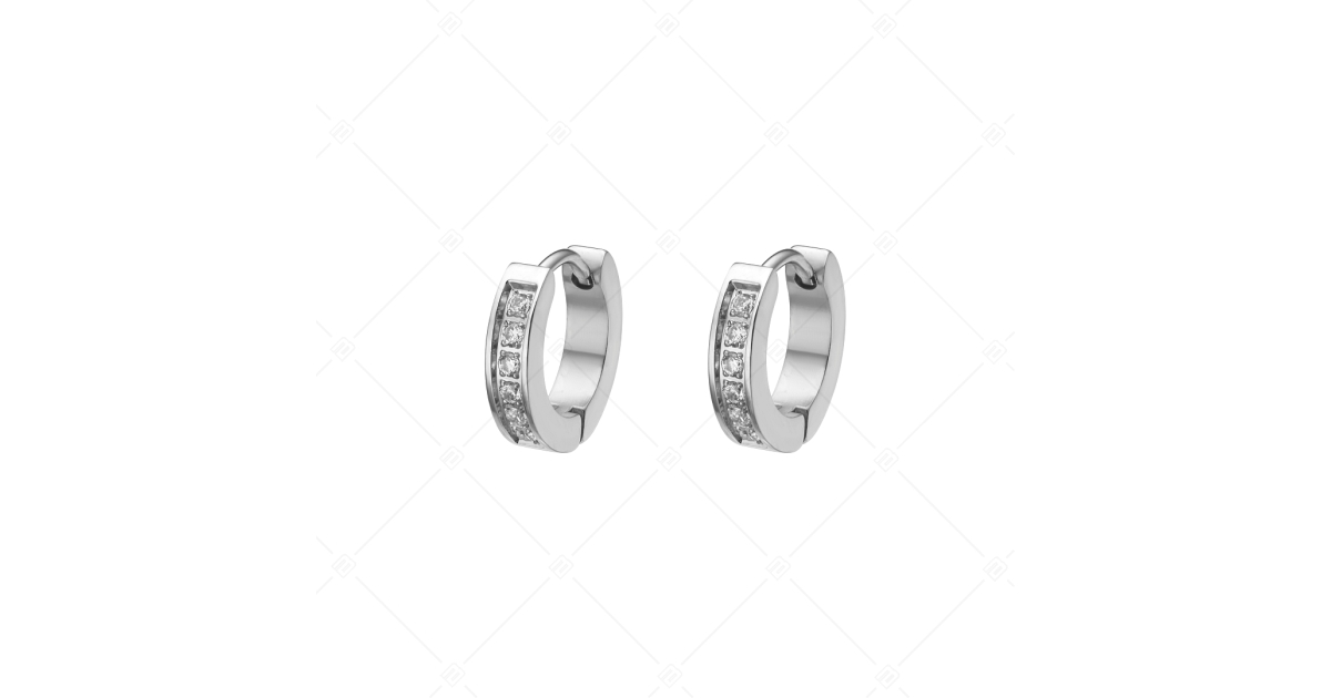 Antiallergische, medizinischer Band Ohrringe von 316L-Edelstahl mit Gelenkverschluss. Ausgestattet mit hochwertiger Hochglanzpolierung. In der mitte befindet sich ein Einschnitt, der mit glitzernden Zirkonia Edelsteinen in einer Reihe verziert ist.