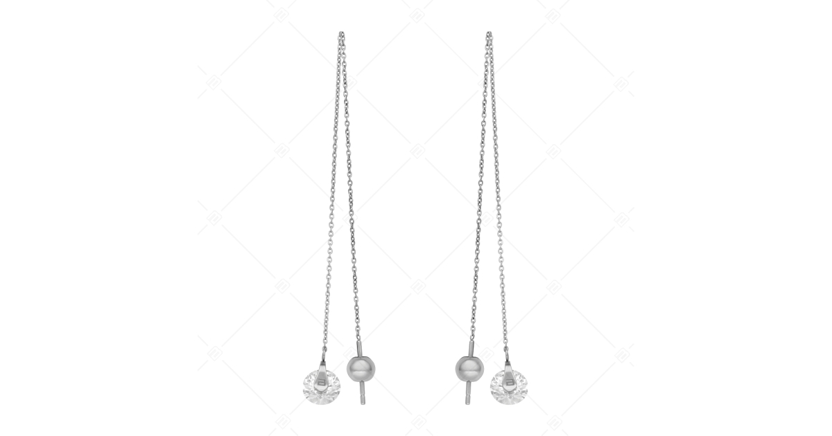 Einzigartige, trendige Ohrringe zum Durchziehen mit einer kleinen Kugel an einer langen dünnen Kette und einem funkelnden Zirkonia Edelstein am Ende. Schmuck aus medizinischem 316L-Edelstahl mit Spiegelglanzpolierung. Aufgrund seines Materials ist es extrem langlebig, nutzt sich nicht ab, verfärbt sich nicht.