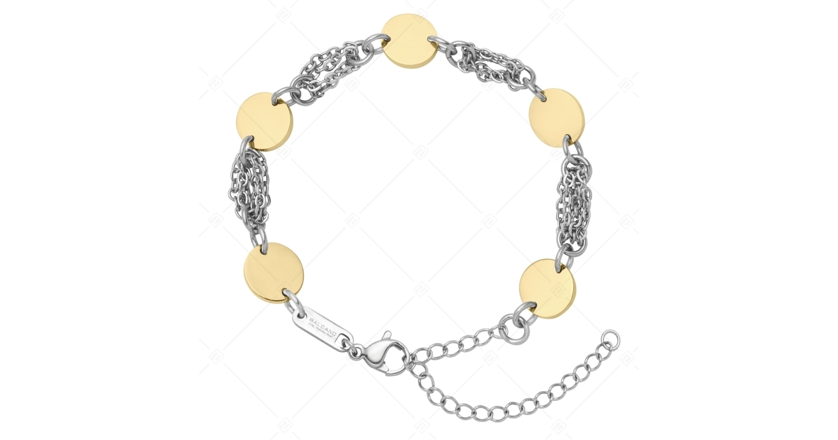 Modisches Armband aus silberfarbener, 4 Reihen Flachen Ankerkette, verbunden durch runde, flache, 18K vergoldete Elemente. Aufgrund ihres Designs eignen sie sich für eine Gravur, so dass sie zu einem persönlichen, einzigartigen Schmuckstück werden können. Schmuck aus medizinischem, rostfreiem 316L -Edelstahl mit hochwertiger Hochglanzpolierung.