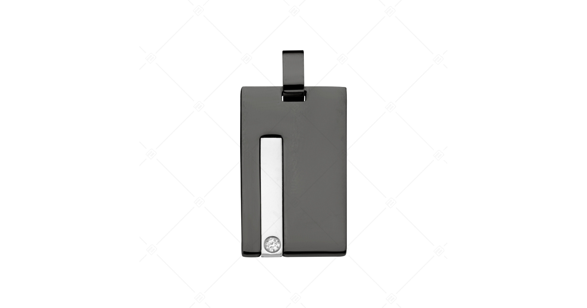 Rechteckiger Anhänger aus antiallergischem medizinischer 316L-Edelstahl mit schwarzer PVD-Beschichtung. Unten macht ihn ein silberfarbener zierstreifen einzigartig, der mit einem schönen Zirkoniastein besetzt ist. Die oberfläche kann sogar graviert werden.