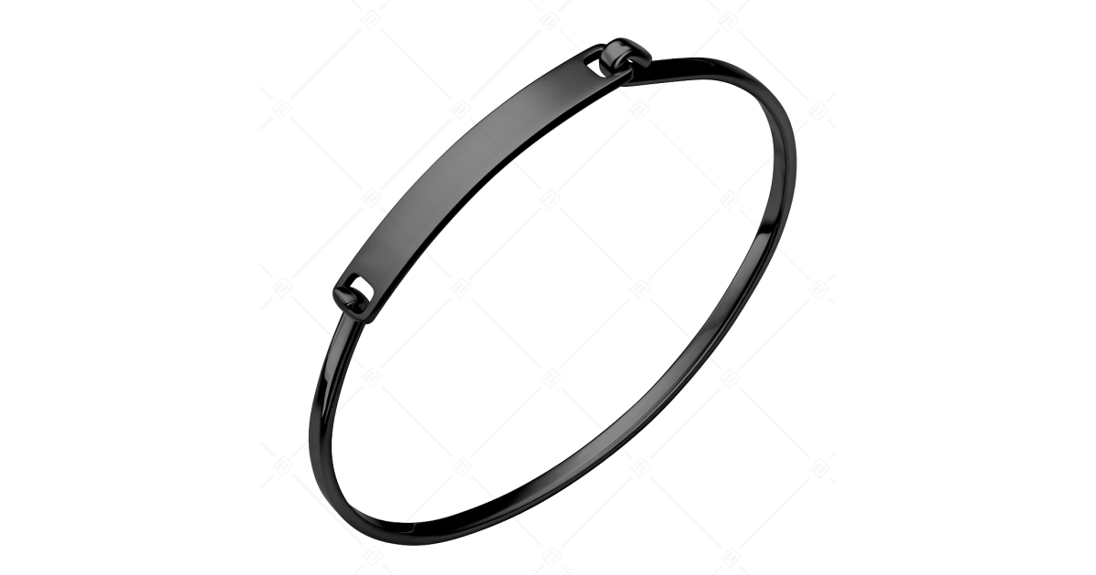 Minimalistisch gestalteter Armreif aus Edelstahl mit aufklappbarem, gravierbarem Kopfteil. Der Armreif ist aus medizinischem 316L-Edelstahl gefertigt, hochglanzpoliert und schwarz PVD-beschichtet.
