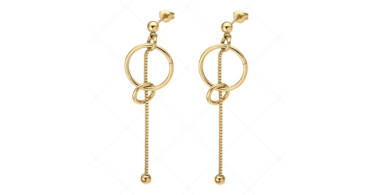 Modische Ohrringe in antiallergischem medizinischer 316L-Edelstahl mit 18K vergoldet. Dekoriert mit zwei Reifen auf einer langen Kette mit Ohrsteckerverschluss.