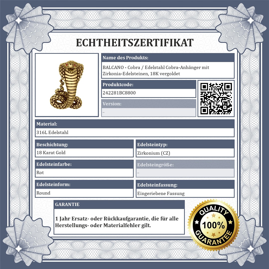 Das Material ist antiallergisch, abriebfest und nicht scheuernd. Die Augen der Kobra sind aus roten Zirkonia-Edelsteinen gefertigt.
