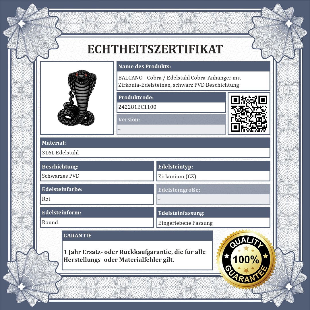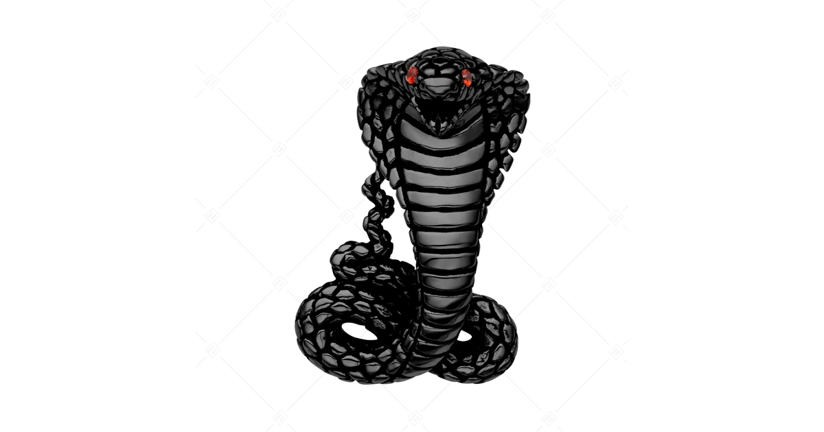Das Material ist antiallergisch, abriebfest und nicht scheuernd. Die Augen der Kobra sind aus roten Zirkonia-Edelsteinen gefertigt.