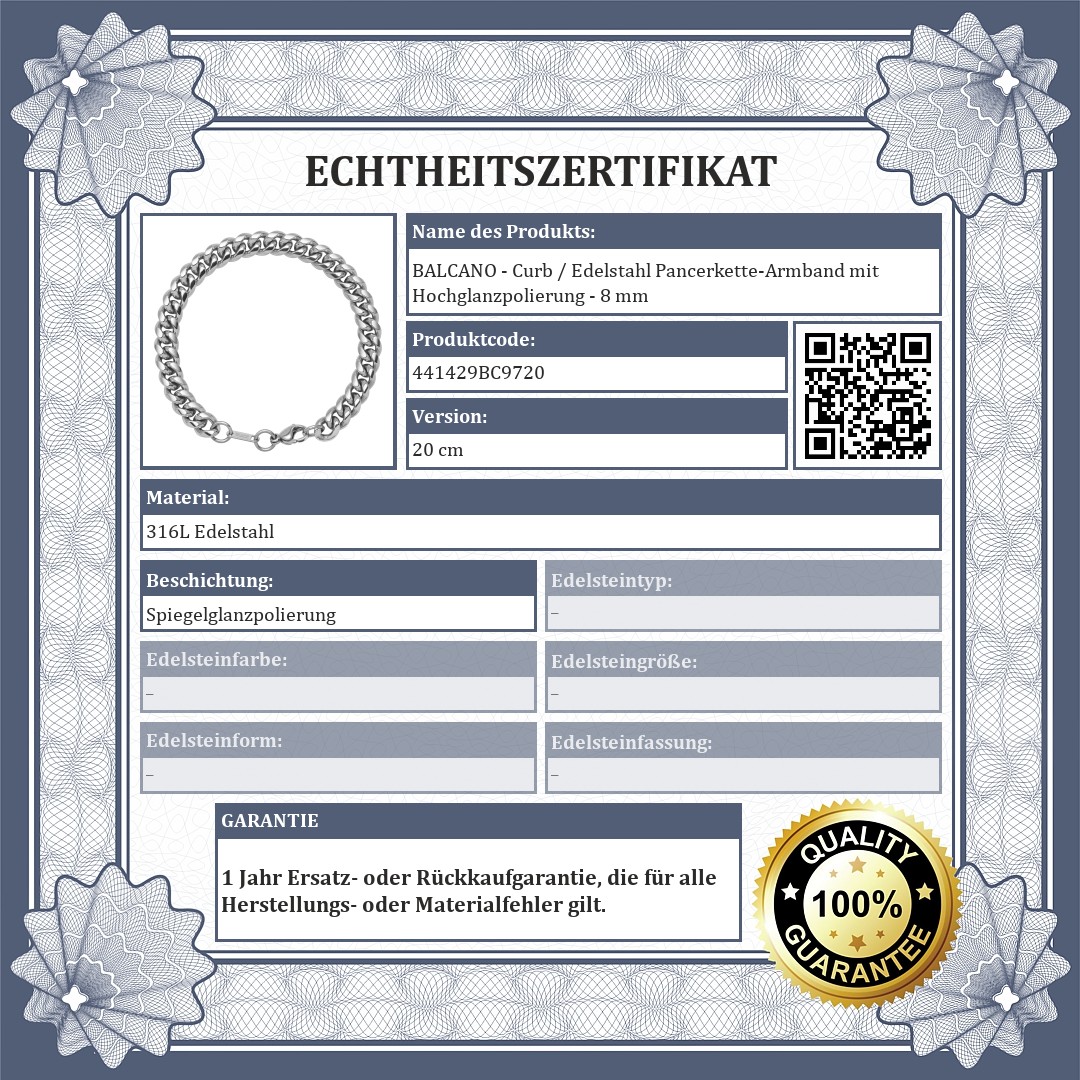 BALCANO - Curb / Edelstahl Pancerkette-Armband mit Hochglanzpolierung - 8 mm