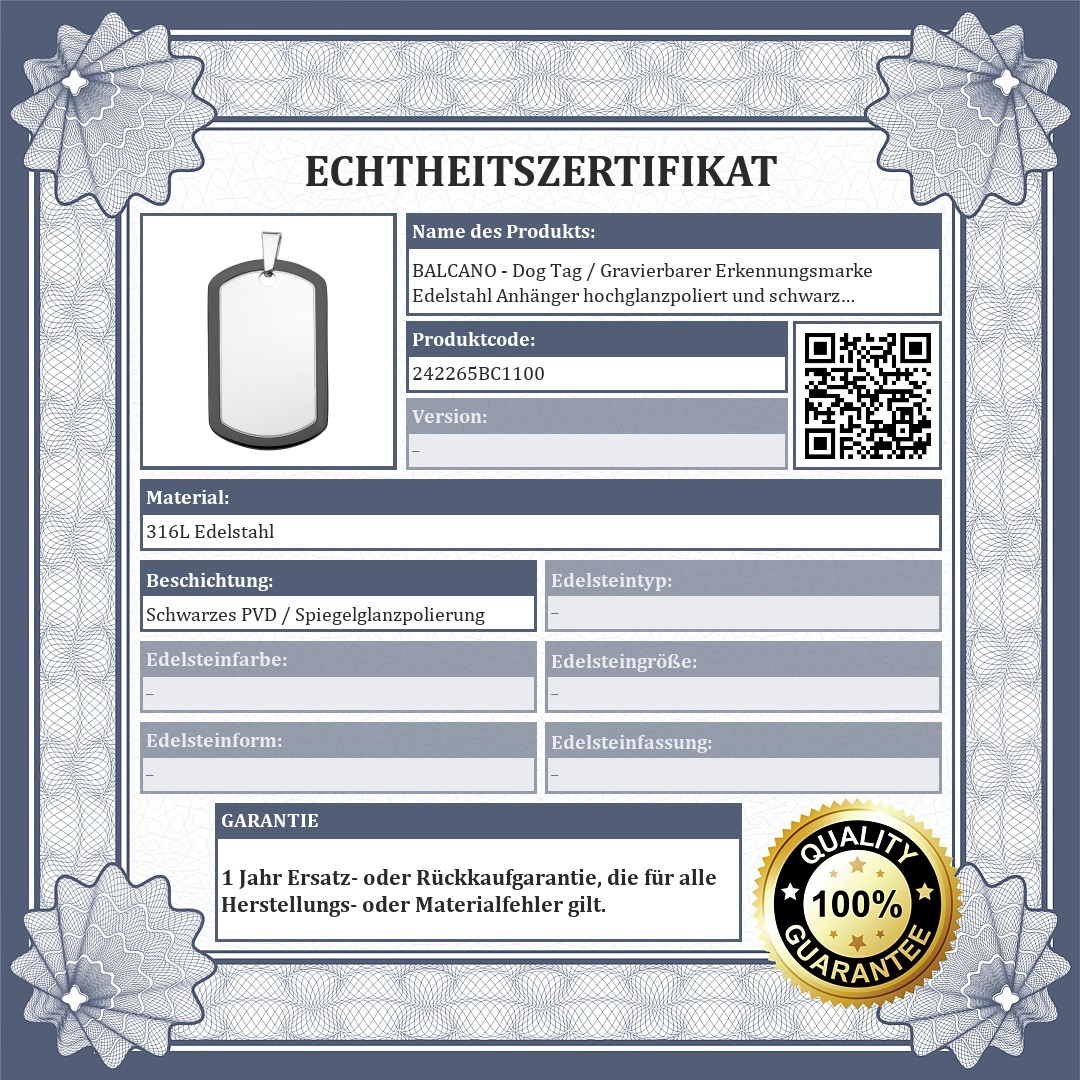 BALCANO - Dog Tag / Gravierbarer Erkennungsmarke Edelstahl Anhänger hochglanzpoliert und schwarz PVD beschichtet