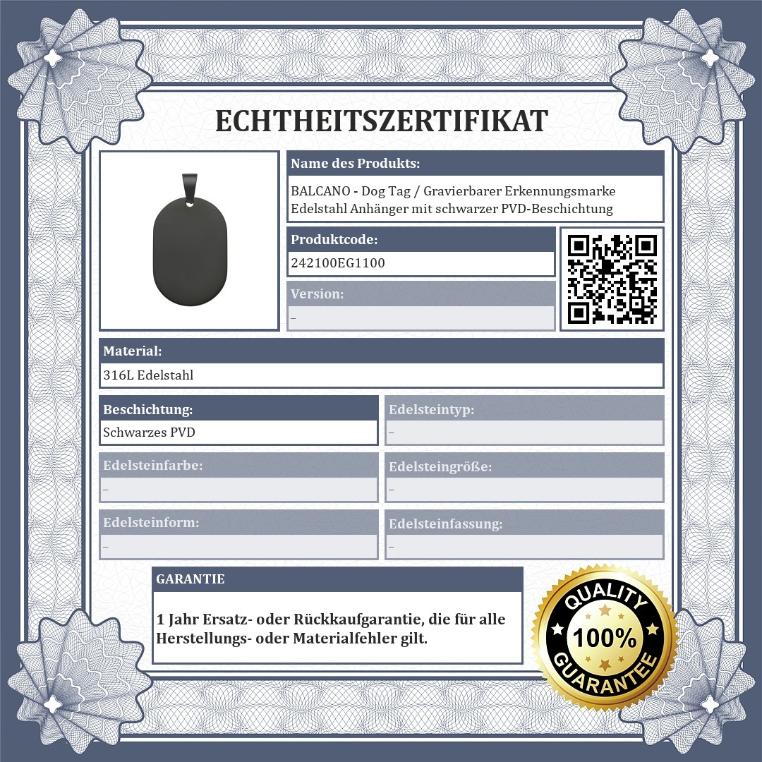 BALCANO - Dog Tag / Gravierbarer Erkennungsmarke Edelstahl Anhänger mit schwarzer PVD-Beschichtung