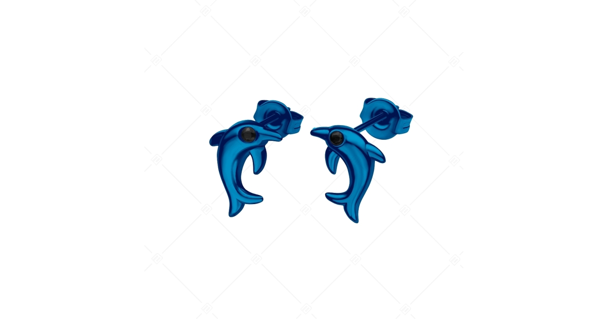 Ohrringe in Form eines Delphins aus 316L-Edelstahl mit blauen PVD-beschichteten Titan-und schwarzen Zirkonia-Edelsteinen als Augen. Antiallergischer Schmuck, den jeder sicher tragen kann. Dank seines Materials verfärbt er sich nicht, nutzt sich nicht ab und ist unempfindlich gegen Reinigungsmittel und Heilwasser. Ein schönes Zubehör für das tägliche Tragen.
