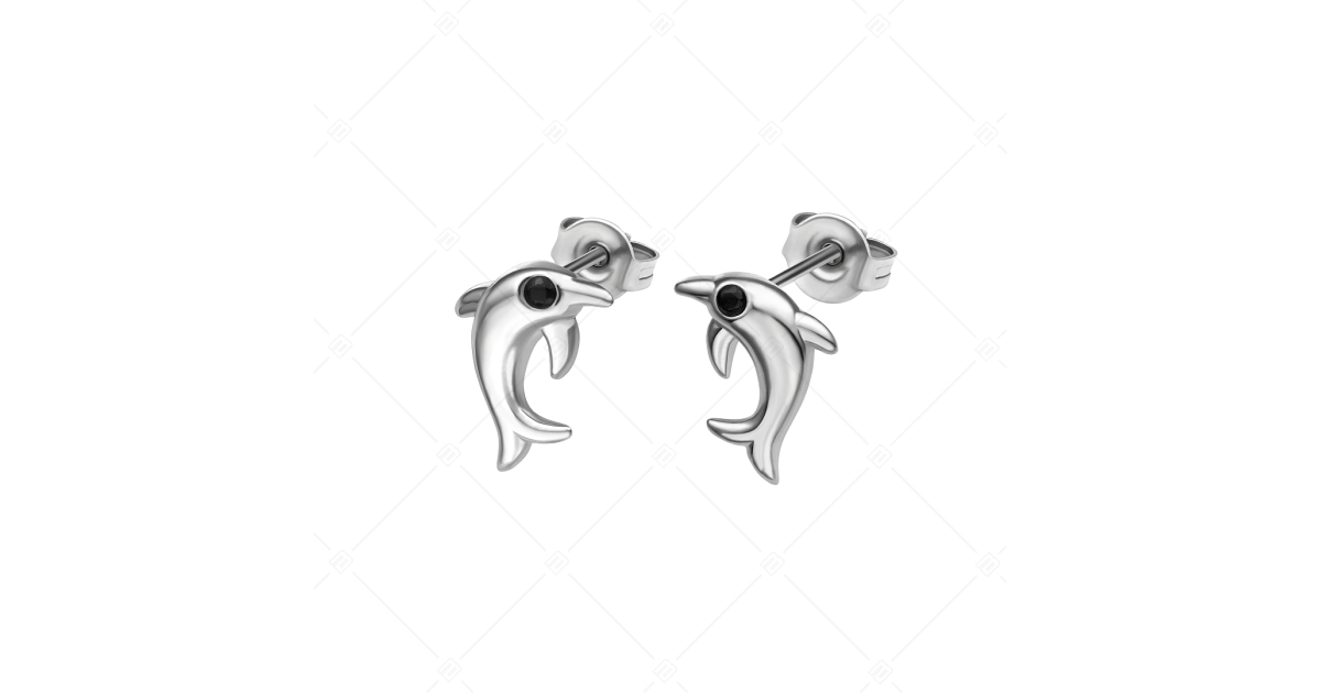 Ohrringe in Form eines Delphins aus 316L-Edelstahl mit Hochglanzpolierung und schwarzen Zirkonia-Edelsteinen als Augen. Antiallergischer Schmuck, den jeder sicher tragen kann. Dank seines Materials verfärbt er sich nicht, nutzt sich nicht ab und ist unempfindlich gegen Reinigungsmittel und Heilwasser. Ein schönes Zubehör für das tägliche Tragen.