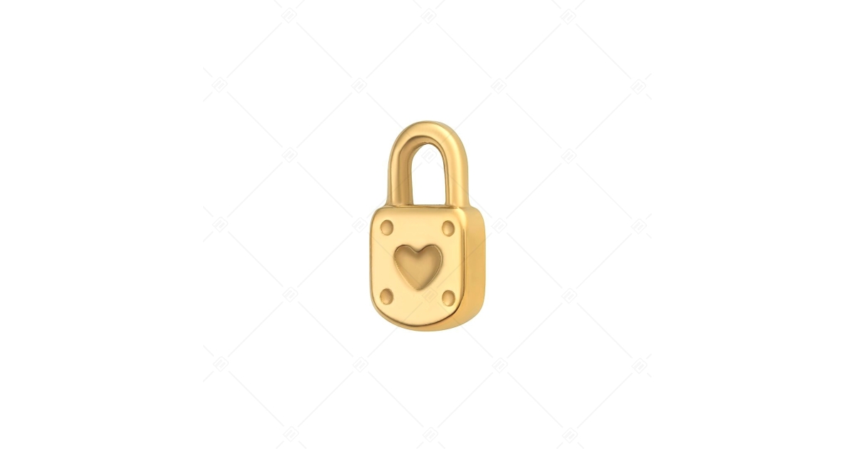 Süßer Charme in Form eines Vorhängeschlosses, der in der Mitte mit einem Herzmuster verziert ist. 18K vergoldetes Zubehör. Schmuck aus medizinischem, antiallergischem 316L-Edelstahl.