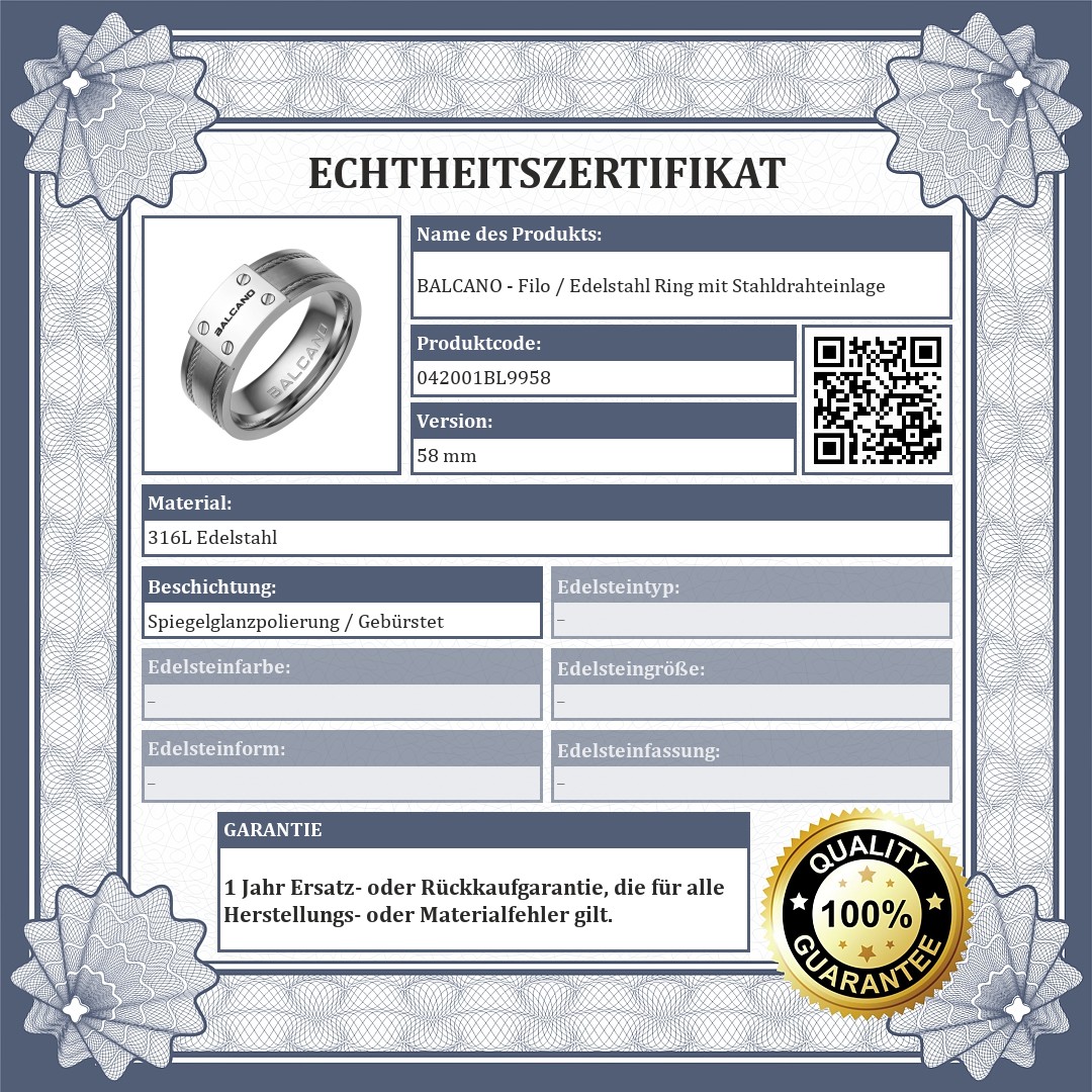 Schmuck aus antiallergischem, hochglanzpoliertem 316L-Edelstahl. Ein wirklich einzigartiges Schmuckstück mit einer Stahllitze an beiden Rändern und einer kleinen Plakette in der Mitte mit dem Markennamen BALCANO.