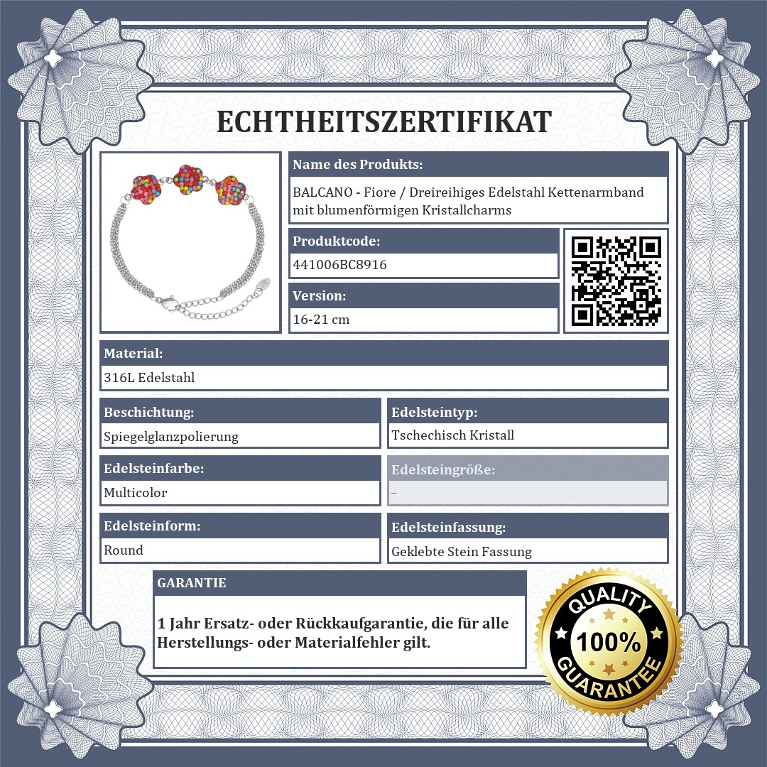 Ein Armband mit mehrfarbig schimmernden tschechischen Kristallen und blumenförmigen Anhängern. Dreireihiges, abgeflachtes Ankerkettenarmband aus medizinischem 316L-Edelstahl. Dank seines Materials ist er extrem langlebig und wird sich nicht abnutzen oder verfärben.