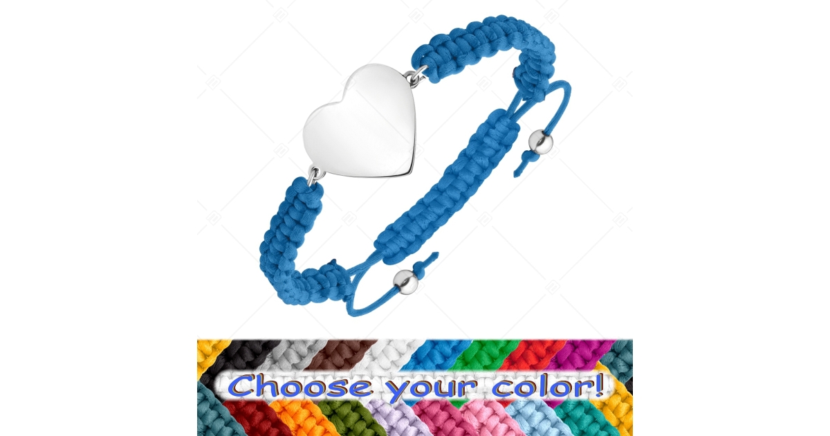 Handgefertigtes, verstellbares Armband. Das Material ist extrem robust und für den Alltag geeignet. Das Armband aus geflochtenem Polyestermaterial ist mit einem herzförmigen 316L- Edelstahl Kopfstück mit glatter, gravierbarer Oberfläche und Hochglanzpolierung.