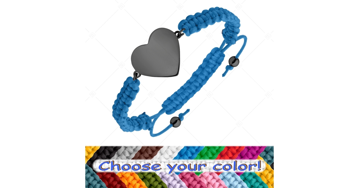 Handgefertigtes, verstellbares Armband. Das Material ist extrem robust und für den Alltag geeignet. Das Armband aus geflochtenem Polyestermaterial ist mit einem herzförmigen 316L-Edelstahl Kopfstück mit glatter, gravierbarer Oberfläche und schwarzem PVD-Beschichtung.