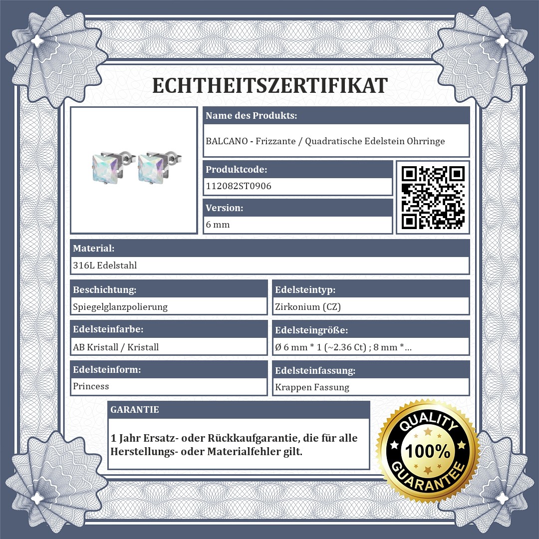 Bunte Farbe Ohrringe mit quadratischen Zirkonia Edelstein in den Größen 6 mm und 8 mm. Schmuck aus medizinischem 316L-Edelstahl, der sich aufgrund seines Materials nicht abnutzt oder verfärbt.