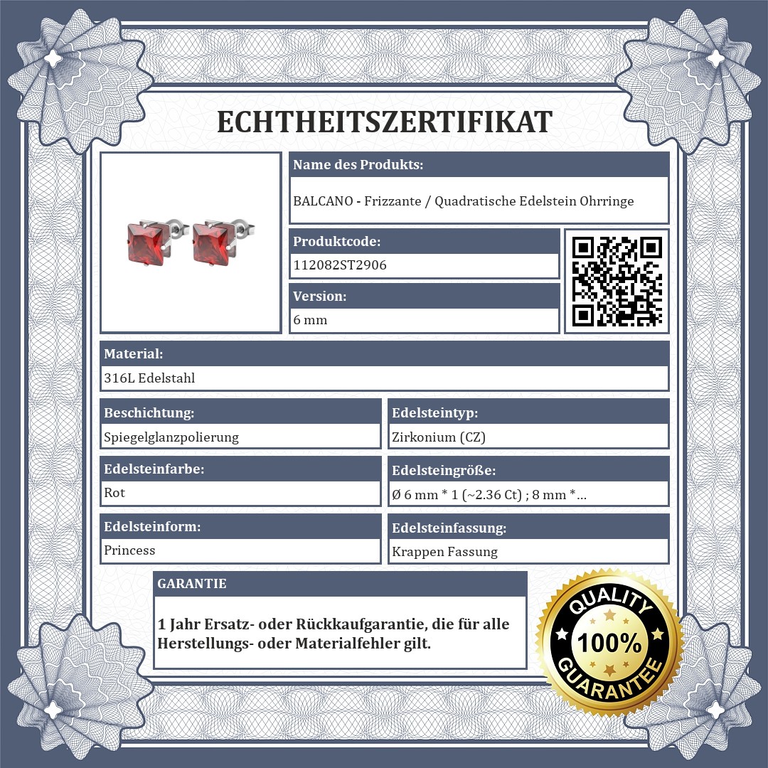 Granatrote Farbe Ohrringe mit quadratischem Zirkonia Edelstein in den Größen 6 mm und 8 mm. Schmuck aus medizinischem 316L-Edelstahl, der sich aufgrund seines Materials nicht abnutzt oder verfärbt.
