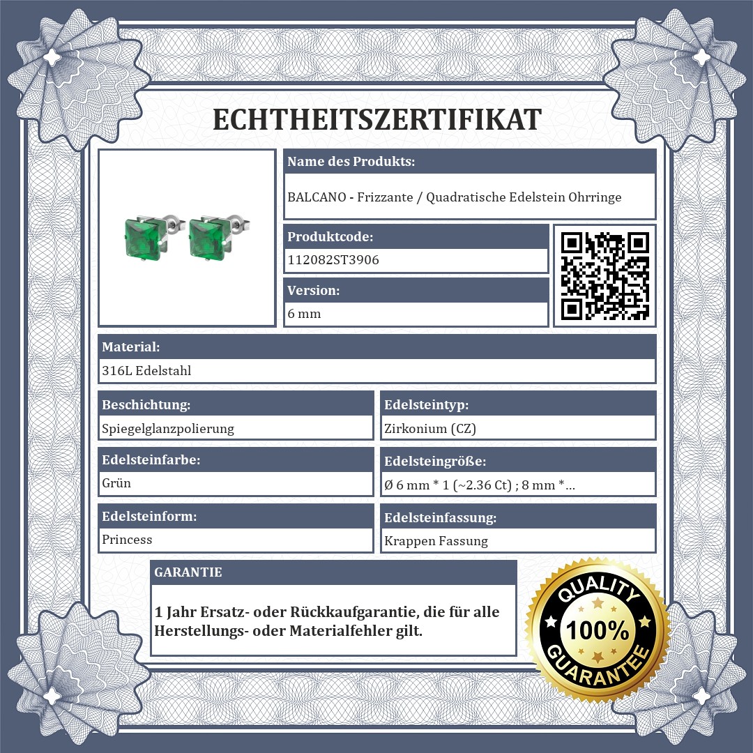 Grüne Farbe Ohrringe mit quadratischem Zirkonia Edelstein in den Größen 6 mm und 8 mm. Schmuck aus medizinischem 316L-Edelstahl, der sich aufgrund seines Materials nicht abnutzt oder verfärbt.