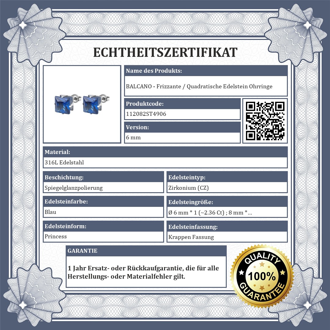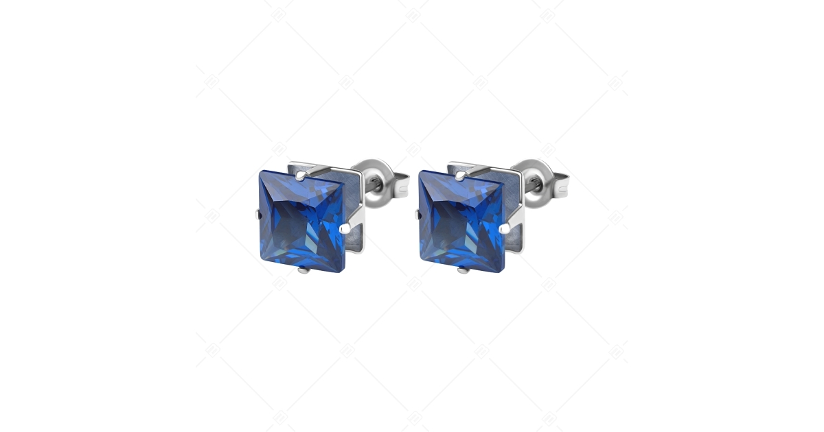 Dunkelblau Farbe Ohrringe mit quadratischem Zirkonia Edelstein in den Größen 6 mm und 8 mm. Schmuck aus medizinischem 316L-Edelstahl, der sich aufgrund seines Materials nicht abnutzt oder verfärbt.