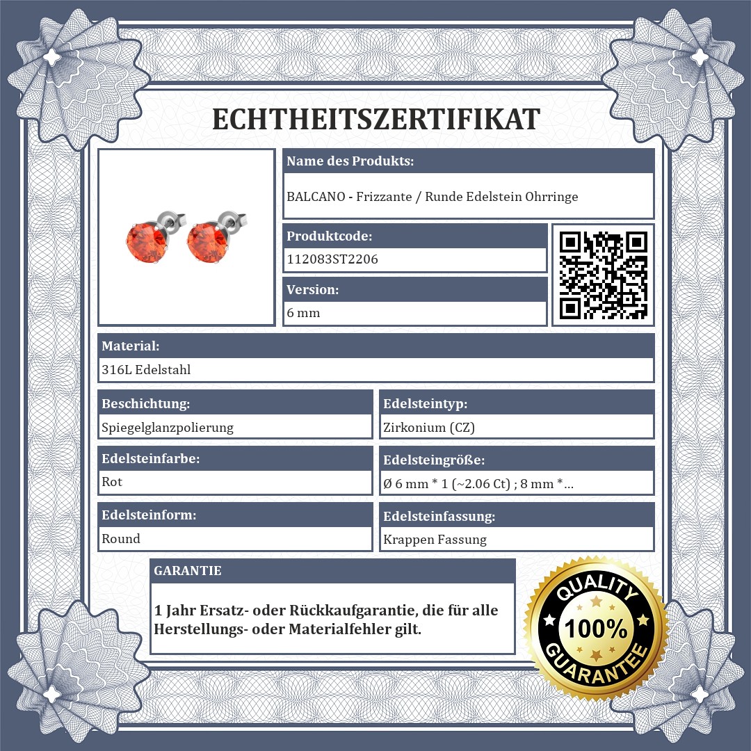 Hyazinthrote Farbe Ohrringe mit runden Zirkonia Edelstein in den Größen 6 mm und 8 mm. Schmuck aus medizinischem 316L-Edelstahl, der sich aufgrund seines Materials nicht abnutzt oder verfärbt.