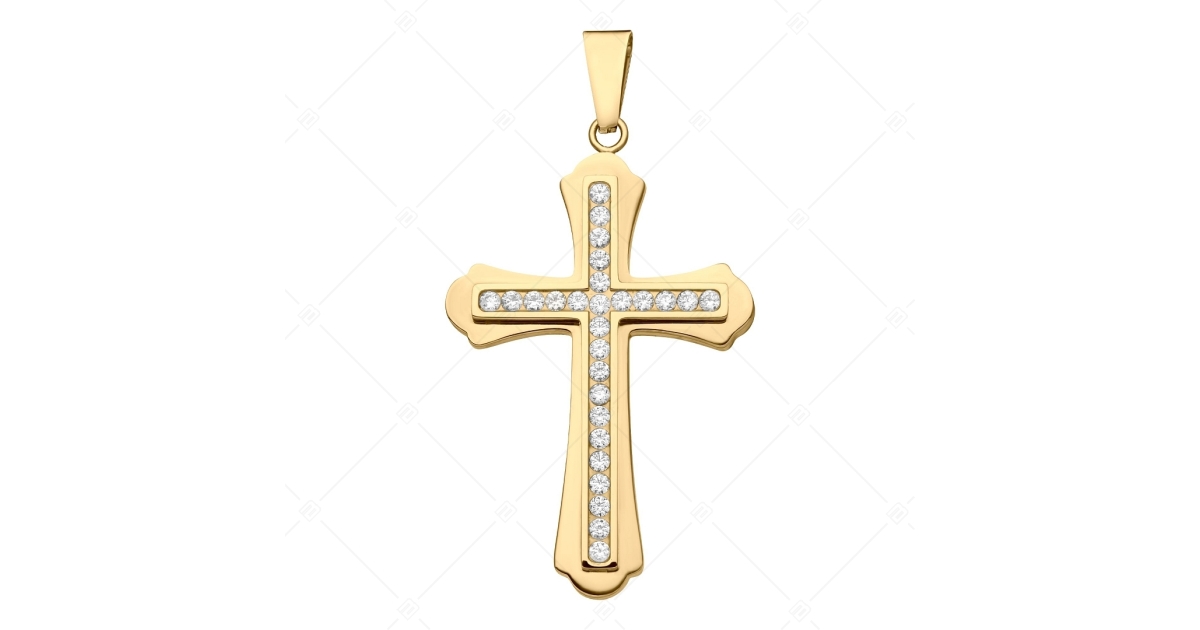 Elegantes und symbolisches Zubehör aus allergiefreiem 316L-Edelstahl. Der Anhänger besteht aus zwei übereinander liegenden Kreuzen. Das Kreuz wird aufgrund seiner einzigartigen Form als "budded" knospenartiges Kreuz bezeichnet. 18K vergoldet. Das obere Kreuz durchgehend mit wunderschönen Zirkonia Kristallen besetzt.