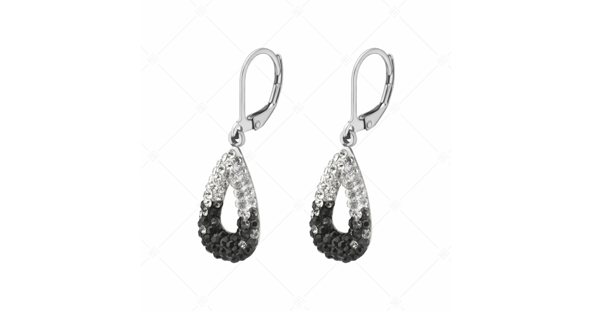 Glänzende, wasserklare und schwarze tropfenförmige Ohrringe mit tschechischen Kristallen besetzt. Schmuck aus medizinischem 316L-Edelstahl, der extrem haltbar ist und sich nicht abnutzt oder verfärbt.