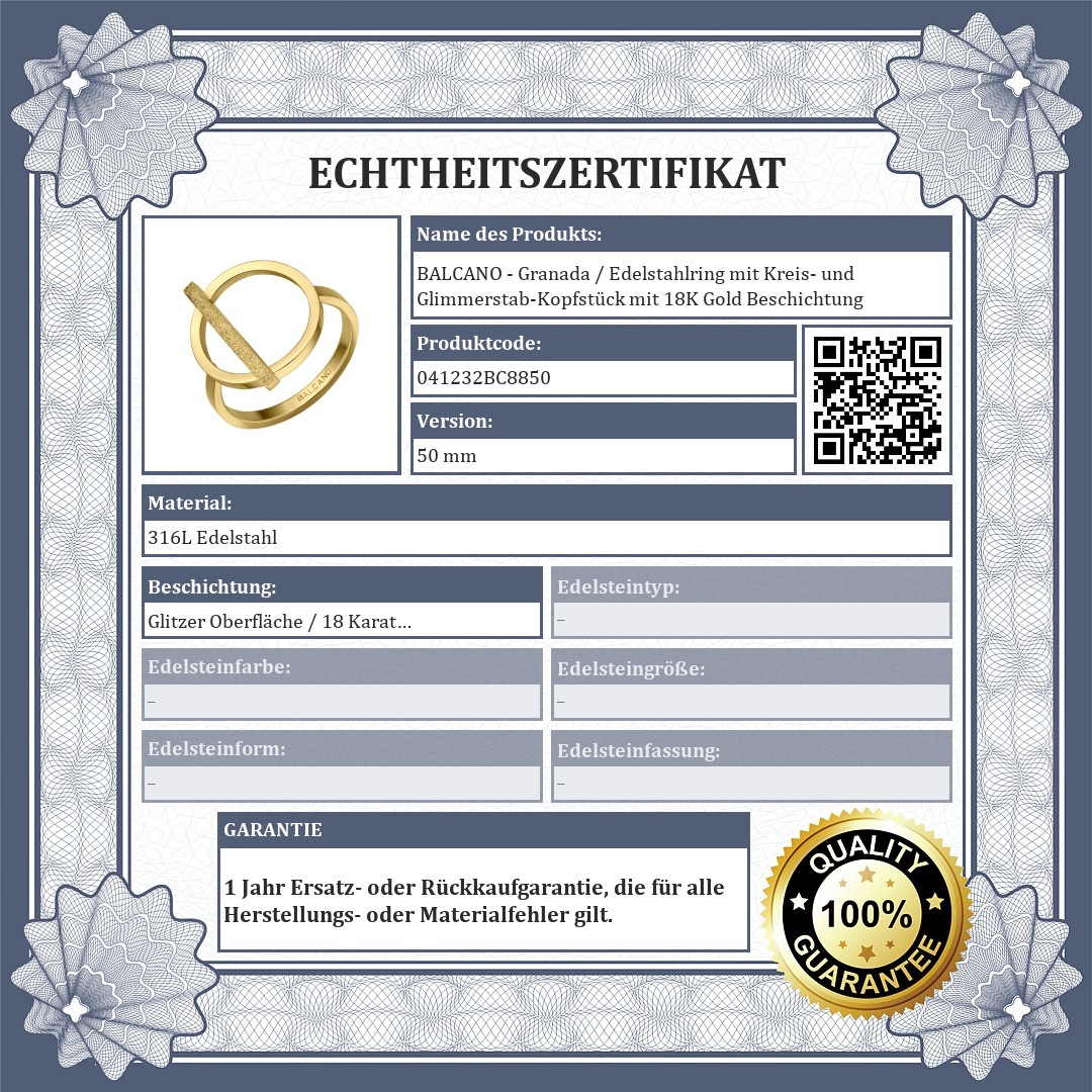 Einzigartiger Ring mit Glitzer Oberfläche und 18K Gold Beschichtung. Hergestellt aus hochwertigem medizinischem 316L-Edelstahl, extrem langlebiger Schmuck. Die Verzierung des Rings besteht aus einem Kreis mit einem polierten Glimmerstab.
