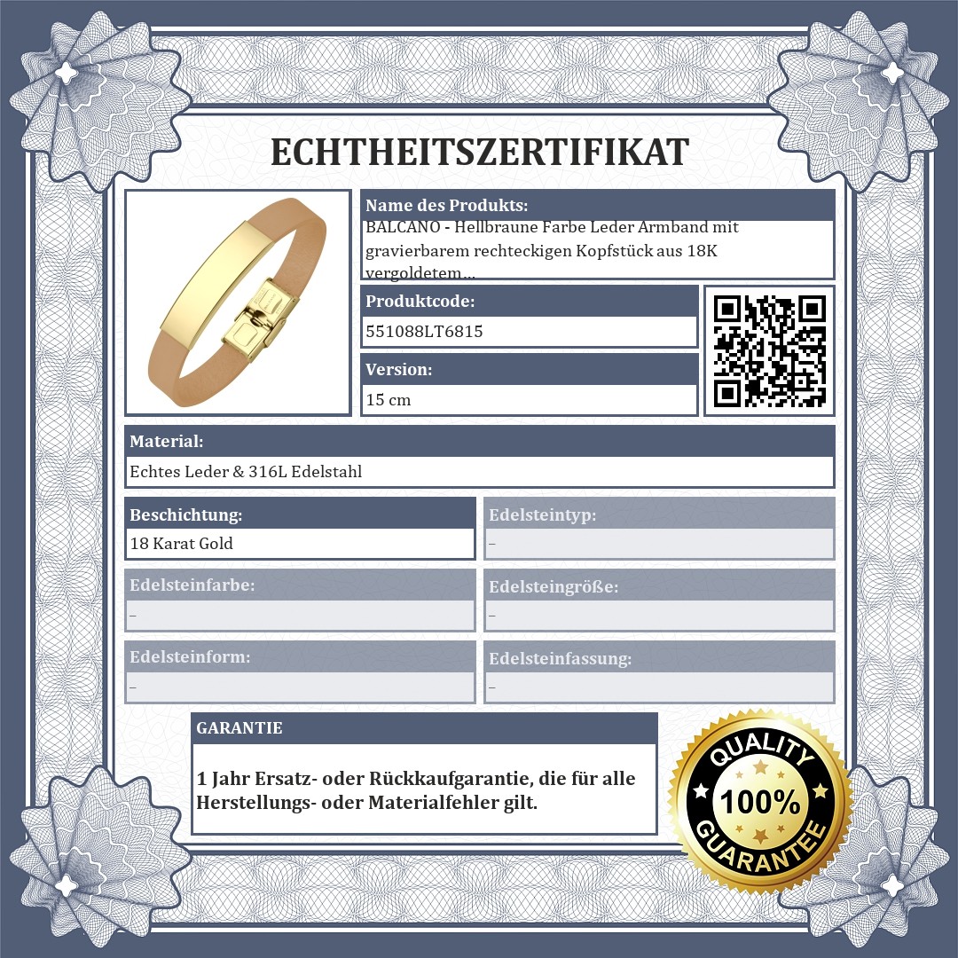 BALCANO - Hellbraune Farbe Leder Armband mit gravierbarem rechteckigen Kopfstück aus 18K vergoldetem Edelstahl