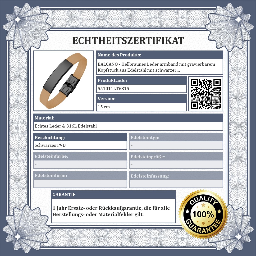 BALCANO - Hellbraunes Leder armband mit gravierbarem Kopfstück aus Edelstahl mit schwarzer PVD-Beschichtung