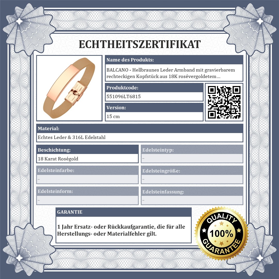 BALCANO - Hellbraunes Leder Armband mit gravierbarem rechteckigen Kopfstück aus 18K rosévergoldetem Edelstahl