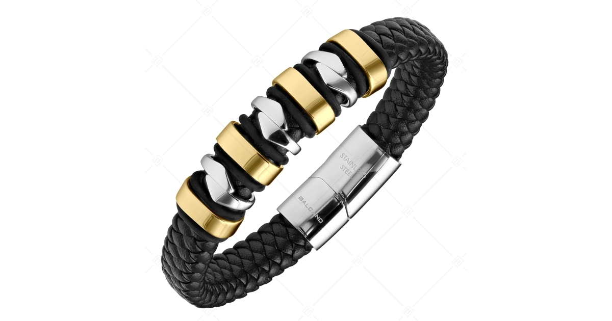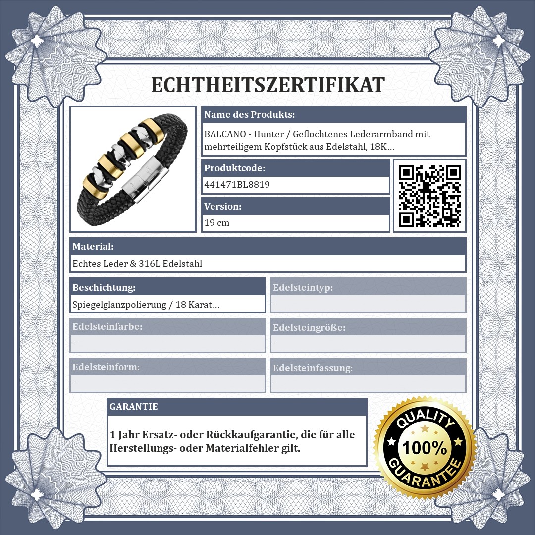 BALCANO - Hunter / Geflochtenes Lederarmband mit mehrteiligem Kopfstück aus Edelstahl, 18K vergoldet