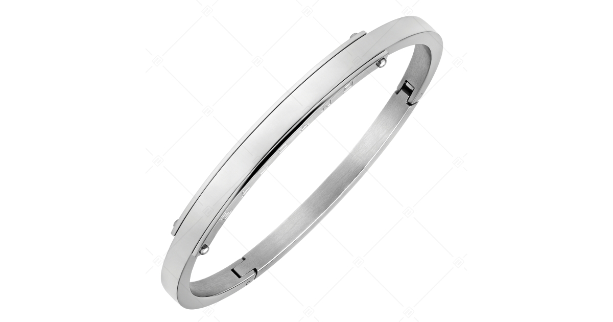 Ovaler, minimalistischer Armreif aus 316L-Edelstahl mit Hochglanzpolierung. Die Oberseite des Armbands ist auf beiden Seiten mit einer vernieteten Platte mit dem BALCANO-Logo verziert. Ein Teil des Armbands lässt sich zum einfachen An- und Ablegen öffnen.