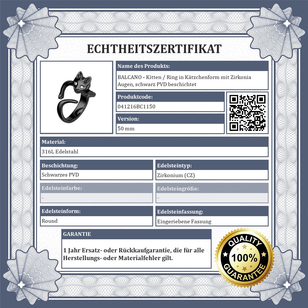 Ring in Katzenform mit zwei klaren Zirkoniasteinen als Augen. Wenn auf den Finger gezogen, sieht es aus wie ein Kätzchen ihn umarmt. Antiallergischer Schmuck aus 316L-Edelstahl in medizinischer Qualität mit schwarzem PVD Beschichtung.