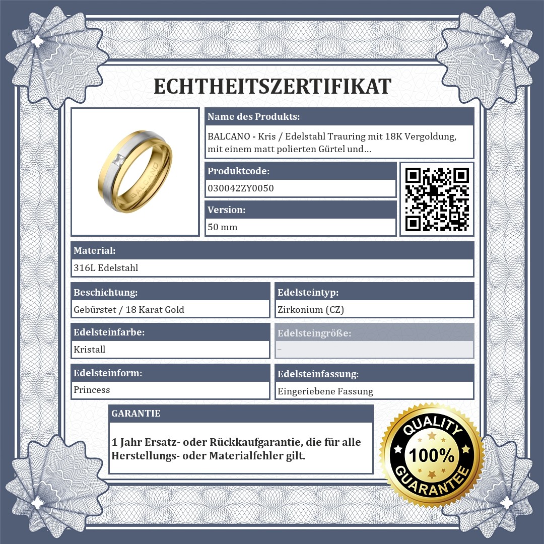 Der ring ist von einem matt polierten gürtel umgeben. Antiallergischer Ehering von 316L-Edelstahl mit Hochglanzpolierung auf dem rest und 18K Vergoldung. Die leicht hervorstehenden, leicht schräg verlaufenden, fadengezogenen matten gürtel ist mit einem zirkonia edelstein verziert. Modischer und eleganter Schmuck. Maximaler Komfort durch abgerundetes, glattes Innendesign.