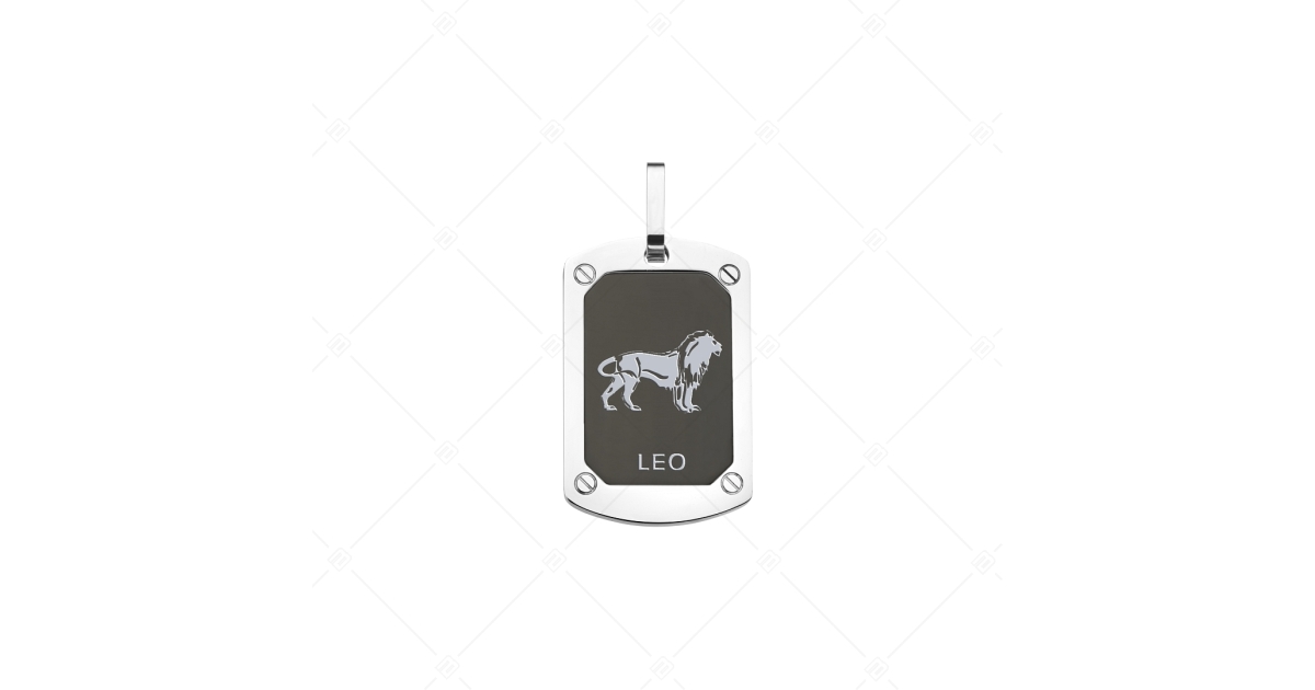 Anti-allergisch, edelstahl, rechteckige horoskop Anhänger mit dem bild des sternzeichens Löwe.. Schmuck aus medizinischem 316L-Edelstahl, der aufgrund seines materials extrem langlebig ist. In der mitte ist das symbol der sternzeichen eingraviert und gemalt. Hochglanzpolierte und matt schwarze PVD-Beschichtung.