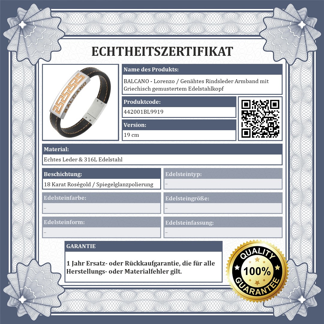 BALCANO - Lorenzo / Genähtes Rindsleder Armband mit Griechisch gemustertem Edelstahlkopf