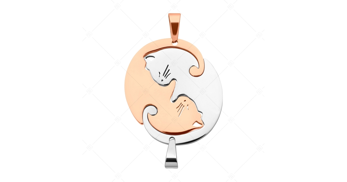 Freundschafts- oder Liebesanhänger bestehend aus zwei zueinander passenden Katzen. Wählen Sie eine Hälfte für sich selbst und die andere Hälfte als Geschenk für einen Freund oder eine geliebte Person. Schmuck aus medizinischem 316L-Edelstahl mit Hochglanzpolierung und 18K Roségold Beschichtung. Das Material ist antiallergisch, abriebfest und verschleißfrei.