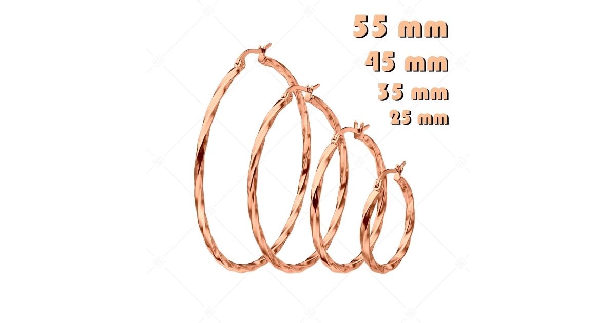 Ohrringe aus 316L-Edelstahl mit gedrehtem Ring und 18K Roségold Beschichtung. Allergenfreier Schmuck, den jeder sicher tragen kann. Dank seines Materials verfärbt er sich nicht, nutzt sich nicht ab und ist unempfindlich gegenüber Spa und Reinigungsmitteln.