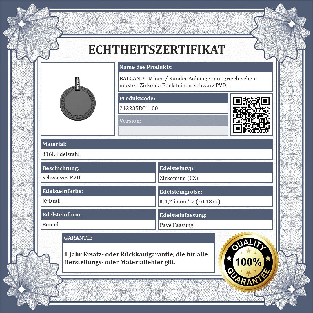 BALCANO - Mínea / Runder Anhänger mit griechischem muster, Zirkonia Edelsteinen, schwarz PVD beschichtet