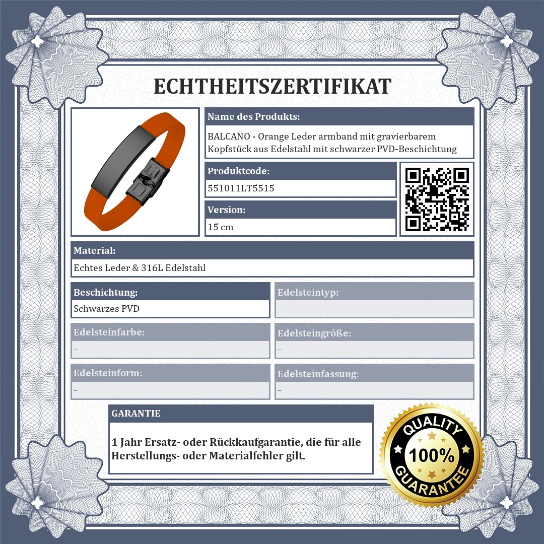 BALCANO - Orange Leder armband mit gravierbarem Kopfstück aus Edelstahl mit schwarzer PVD-Beschichtung